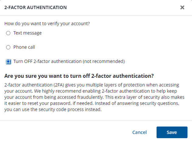 | Webroot: | 2-Factor Authentication can be disabled on your existing Webroot+Carbonite MyAccount if you no longer want the additional layer of security or plan on changing trusted devices. If you disable 2-Factor Authentication, you will no longer receive a call or a text message with a security code when you try to log in to your account. To disable 2-Factor Authentication, follow the steps below: